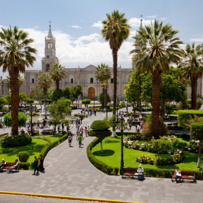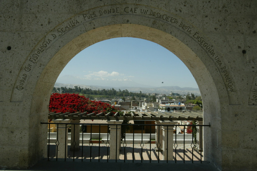 Arequipa liegt weit südlich von Lima in einem fruchtbaren Tal zwischen Wüste und Gebirge. Einst war es wichtigte Bahnstation auf der Verbindungsstrecke der Silberminien Boliviens und der peruanischen Küste. Die „weiβe Stadt“ ist das zweigröβte urbane Zentrum Perus und mit seinen prachtvollen Kolonialbauten aus „weiβem“, vulkanischen Sillar-Gestein ein touristischer Höhepunkt. Einer Legende zufolge war der Inkaherrscher Manco Capac auf einer seiner Reisen von der Schönheit des Tales so angetan, dass er sein Gefolge mit den Worten „ari quipay“ (ja, hier bleiben wir) anhalten ließ und die Stadt gründete.