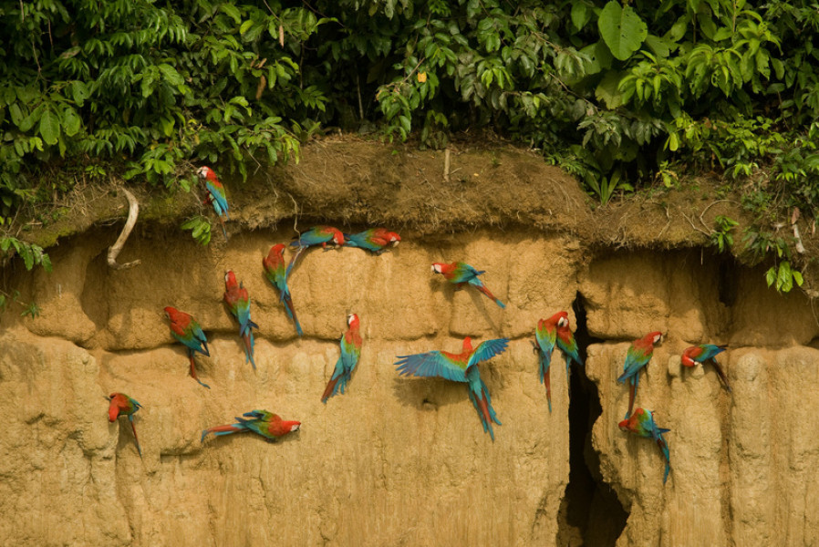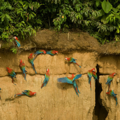 Sehr früh am Morgen machen wir uns auf zur Papageienlecke weiter flussabwärts. Hier können wir Papageie, Sittiche und kleine Aras beobachten, die an die Lecke kommen, um die mineralhaltige Erde zu essen, die sie für ihre Verdauung benötigen. Nach dem Schauspiel frühstücken wir in der Lodge. Anschließend erwandern wir einige Wege, z.B. zu einem großen Kapokbaum und wir können auf unseren 25m hohen Aussichtsturm steigen, um den Blick über den Fluss zu genießen. Am Abend unternehmen wir noch eine Nachtwanderung, um Frösche, Insekten, Schlangen und weitere Tiere zu beobachten.