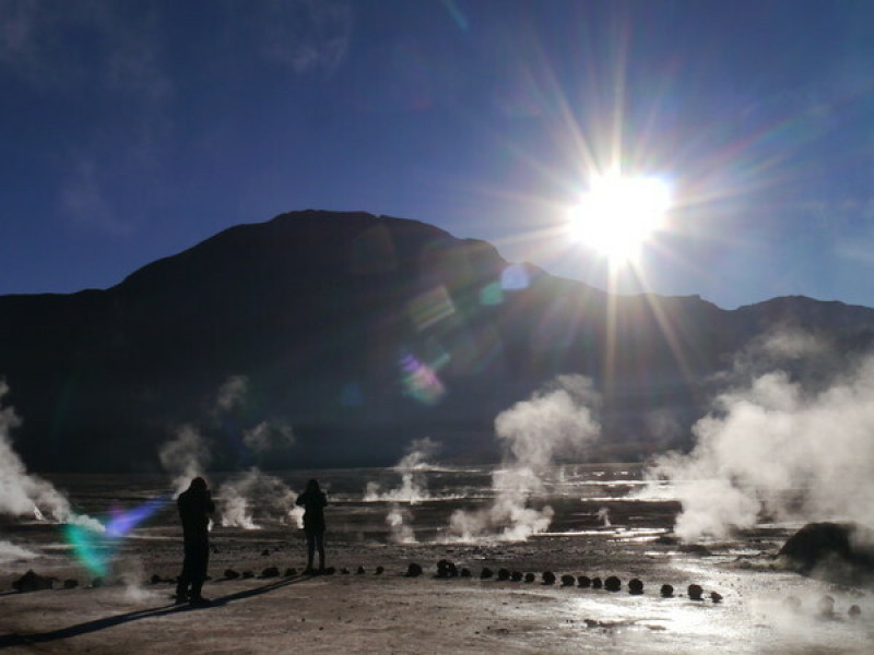 Die El Tatio Geysire befinden sich auf 4.320 Meter Höhe ca. 95 km nördlich von San Pedro de Atacama. Der Besuch des weltweit drittgrößten Geysirfelds ist ein Erlebnis der besonderen Art. Man muss schon früh morgens (gegen 04:00 Uhr) ins San Pedro starten, um die rauchenden Dampfsäulen bei morgendlich kühlen Temperaturen von -5°C in der aufgehenden Morgensonne emporsteigen zu sehen.